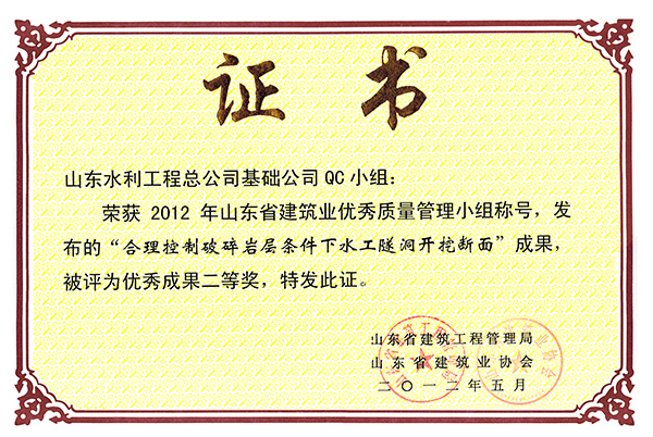九游足球“合理控制破碎岩层条件下水工程隧洞开挖断面”等两项成果荣获2012年山东省建筑业优秀质量管理优秀成果二等奖