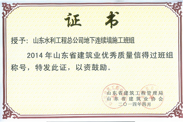九游足球“地下连续墙施工班组”荣获2014年山东省建筑业优秀质量信得过班组称号
