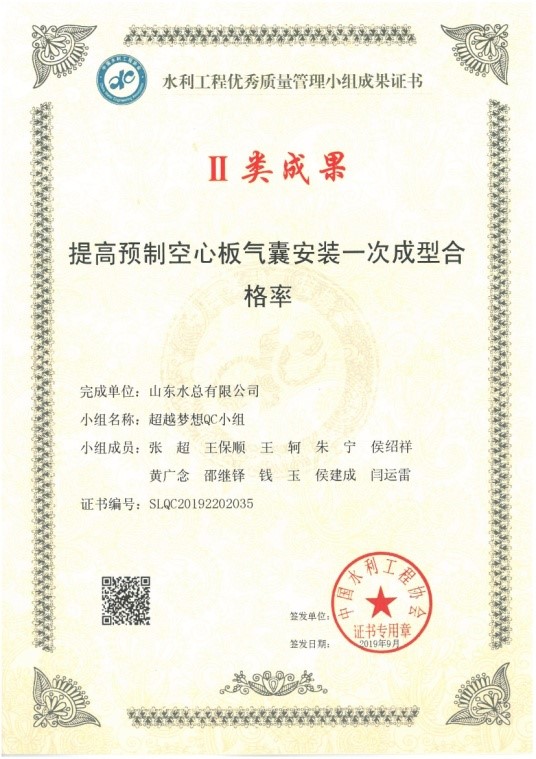 2019年9月24日,由中国水利工程协会举办的2019年度中国水利工程优秀质量管理小组成果发布,九游足球报送的《提高碾压混凝土坝温控效率》和《提高预制空心板气囊安装一次成型合格率》2项成果全部获Ⅱ类成果奖。