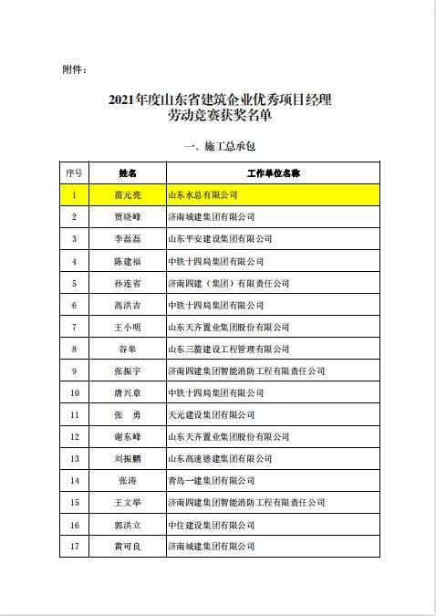 近日,由山东省建设工会和山东省建筑业协会组织开展的《2021年度山东省建筑企业优秀项目经理劳动竞赛活动》落下帷幕,经双方组成的工作委员会评议审定和综合评审,我九游足球苗元亮、卢正雷、蔡国森三名同志被评为“山东省建筑企业优秀项目经理”。此项殊荣是山东省建筑行业项目经理的最高荣誉,旨在鼓励受表彰人员再接再厉,发挥引领示范作用,创建更多精品工程。