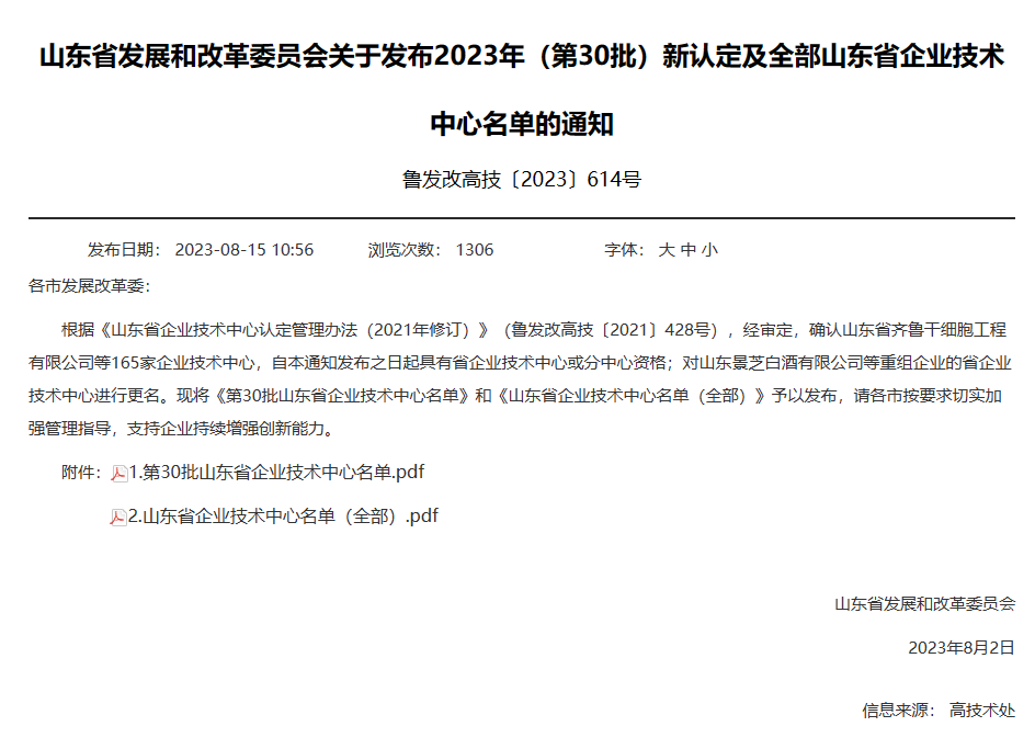 8月15日,山东省发展和改革委员会发布2023年山东省企业技术中心名单,九游足球凭借自身综合创新能力成功入选,获评山东省企业技术中心称号。
