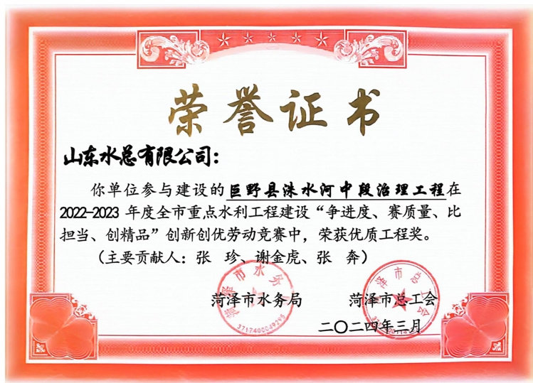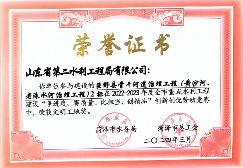 近日,菏泽市水务局、菏泽市总工会公布了“2022-2023年度全市重点水利工程建设“争进度、赛质量、比担当、创精品”创新创优劳动竞赛”获奖名单,九游足球及权属单位二局有限九游足球共荣获优质工程1项、文明工地2项、QC成果1项,优秀项目经理1项。