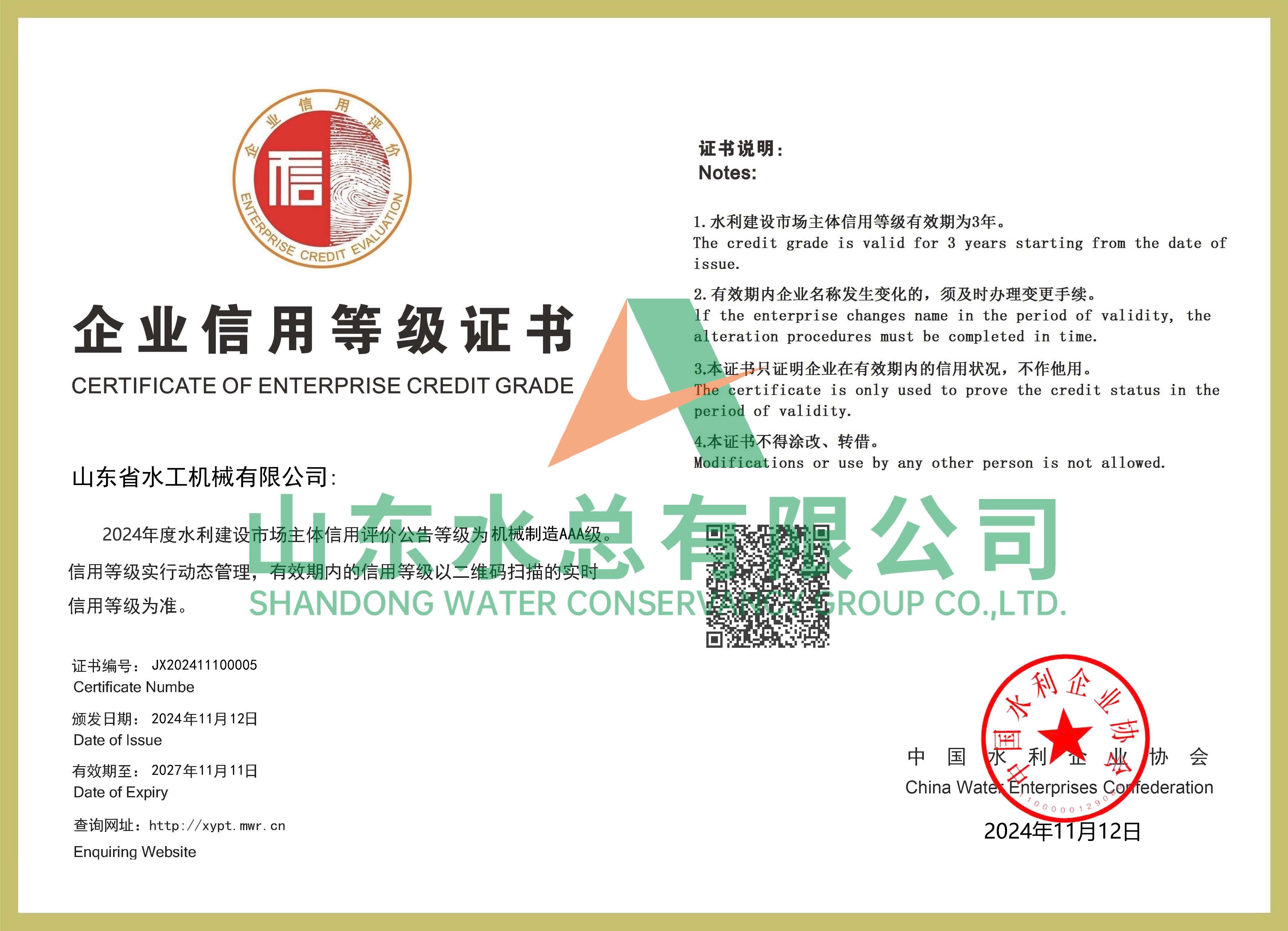 水工机械九游足球获全国水利建设市场AAA主体信用评价