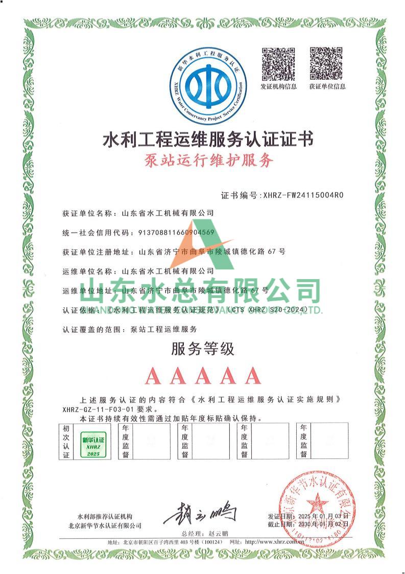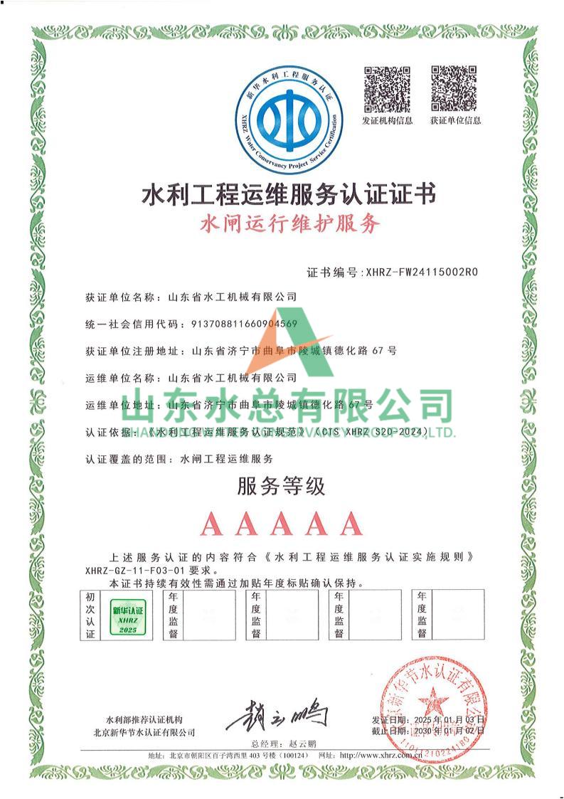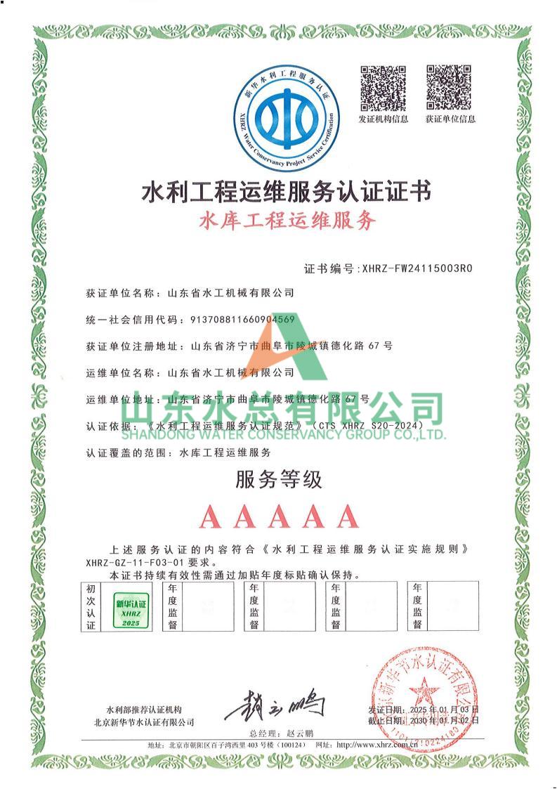 一直以来,水工机械九游足球高度重视水利工程运维服务的质量与专业性,在人员配备、技术应用、管理体系等多方面精心打磨。在认证过程中,历经严格审核,九游足球凭借扎实的运维实力、规范的服务流程以及对水利工程运维高规格的执行标准,赢得了认可。