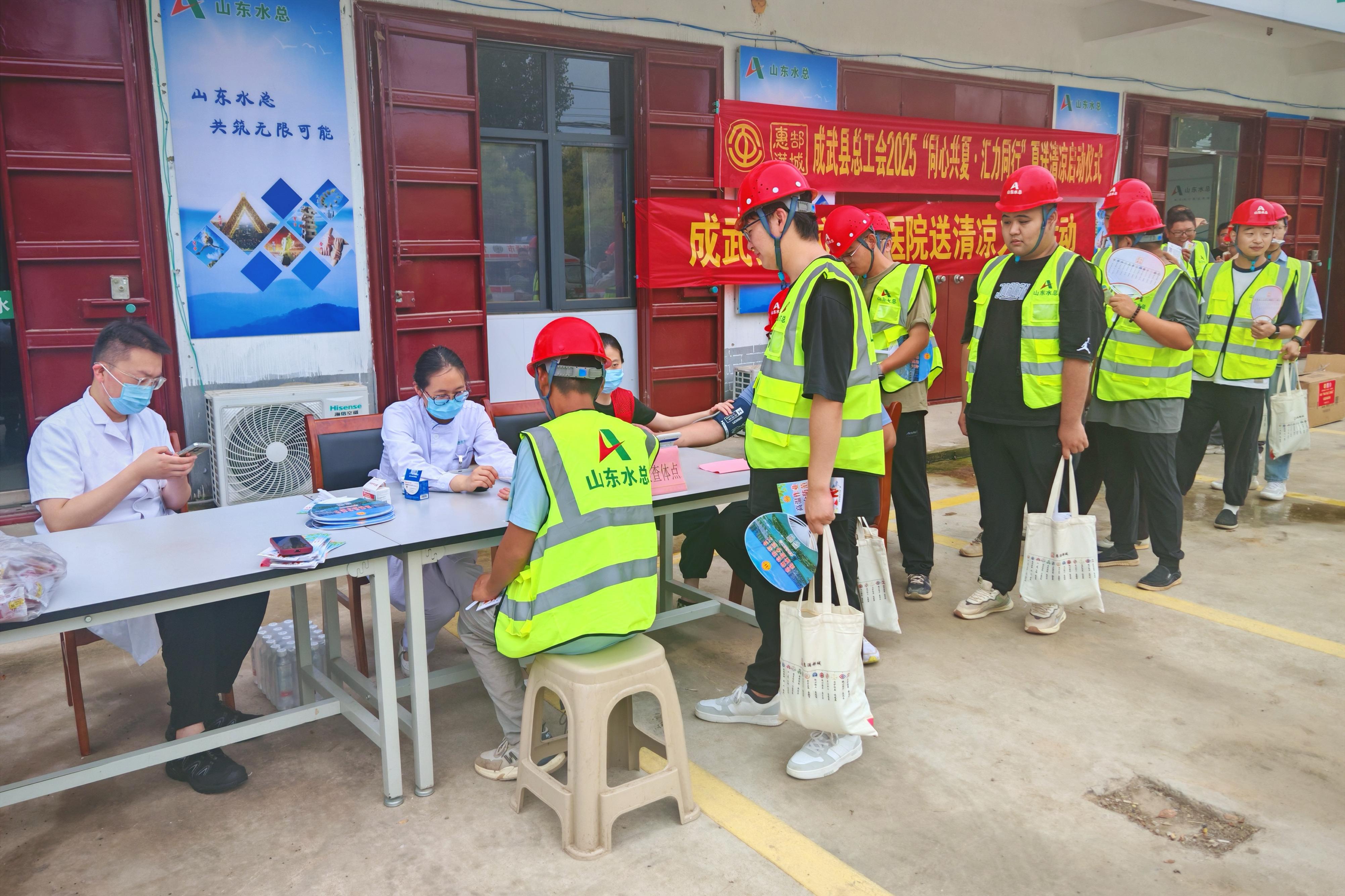 7月23日,菏泽市成武县总工会、成武县公立中医医院一行赴基础有限九游足球成武县引调水工程项目部,开展“同心共夏 汇力同行”夏送清凉活动,慰问高温下奋战的一线工作人员。