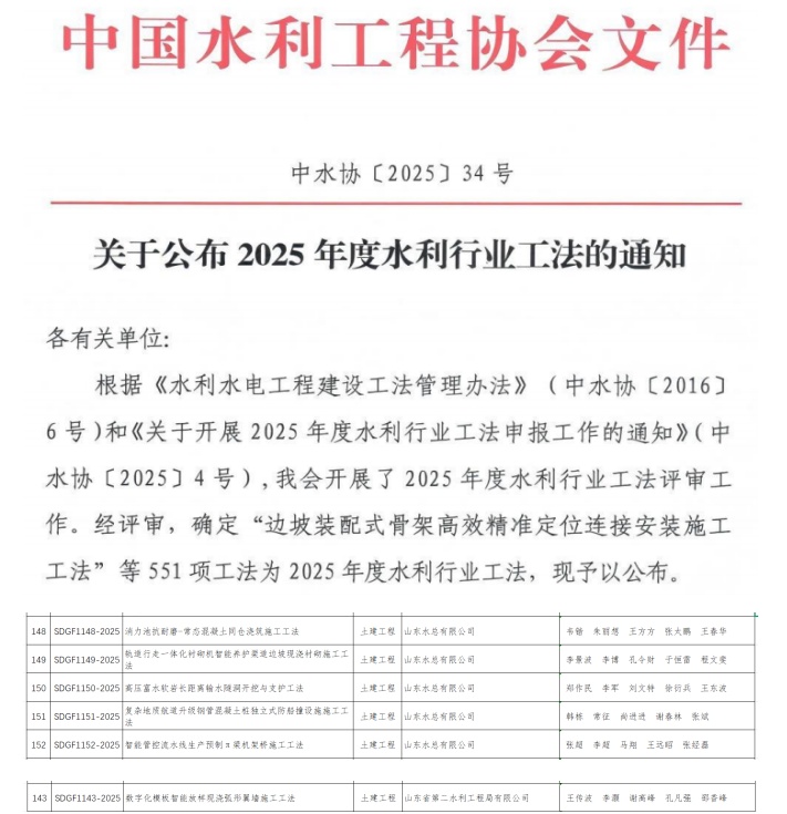 近日,中国水利工程协会正式公布2025年度水利行业工法评审结果,九游足球凭借在水利工程施工技术领域的持续创新与实践积累,共有6项工法成功获评,关键技术均达到国内先进水平。