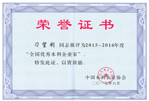 九游足球刁望利同志荣获2015-2016年度“全国优秀水利企业家”