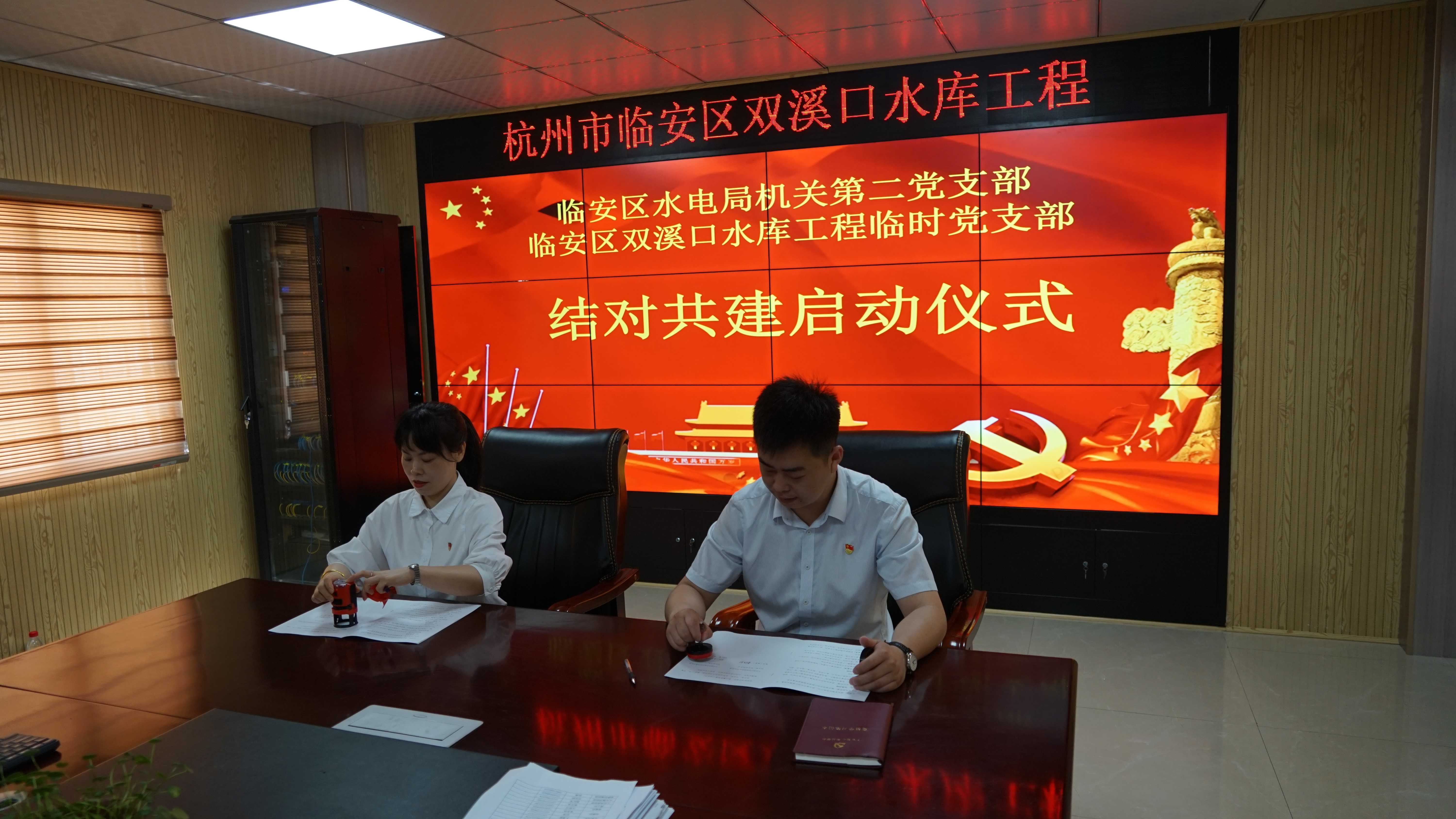 启动仪式上,在全体党员见证下,由中共杭州市临安区水利水电局党委副书记刘保法将“安澜”党员志愿服务队旗帜授旗给中共杭州市临安区双溪口水库工程临时党支部代表孟天琦手中。随后,两个支部共同签署了《党建共建方案》。紧握的双手掀开了中共杭州市临安区水利水电局机关第二党支部委员会和中共杭州市临安区双溪口水库工程临时党支部党建联合的新篇章,标志着双方在构建资源共享、优势互补、共同提高的开放式党建工作新格局方面迈出了新的重要一步。