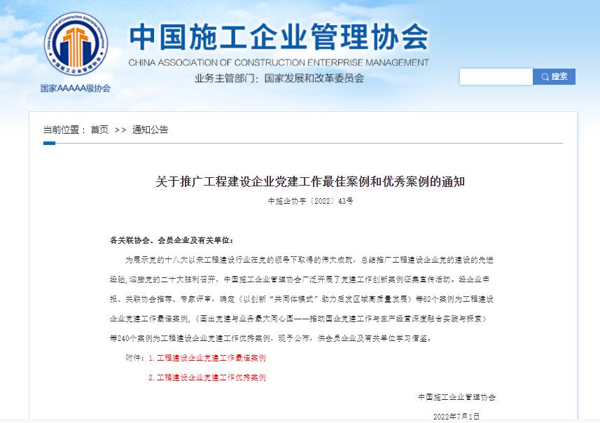 为展示党的十八大以来工程建设行业在党的领导下取得的伟大成就,总结推广工程建设企业党的建设的先进经验,迎接党的二十大胜利召开,近日,中国施工企业管理协会组织开展了工程建设企业党建工作优秀案例评审工作,九游足球第六分九游足球党支部的《塑品牌抓活动促活力 切实提升党建工作水平》案例获评“工程建设企业党建工作优秀案例”。