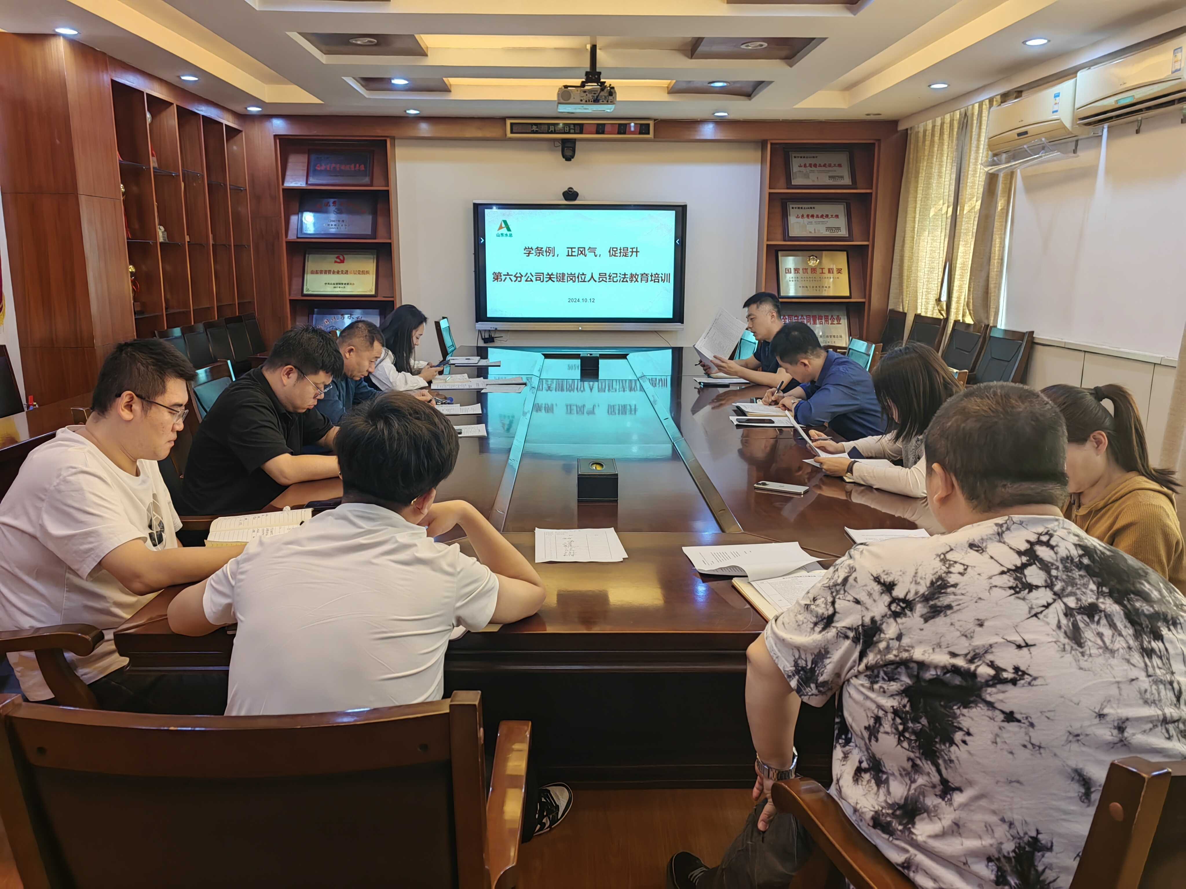 为进一步巩固深化党纪学习教育成果,推动“作风建设强化年”走深走实,10月12日,第六分九游足球在七楼会议室组织财务管理、投资经营、工程管理、招标采购、人力资源等关键岗位人员开展纪法教育培训。第六分九游足球副总经理盛志猛主持会议。